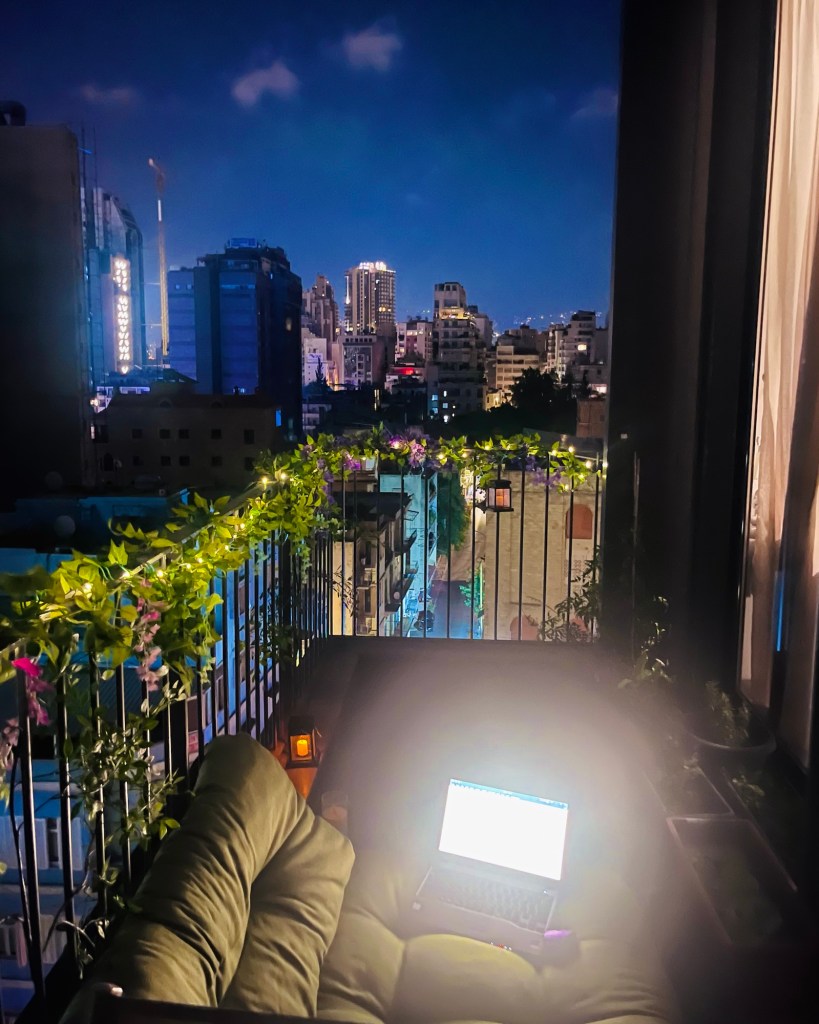 Today, Beirut is a little quieter than usual. I’m lying on my balcony, feeling the wind blowing through my wet hair after showering.