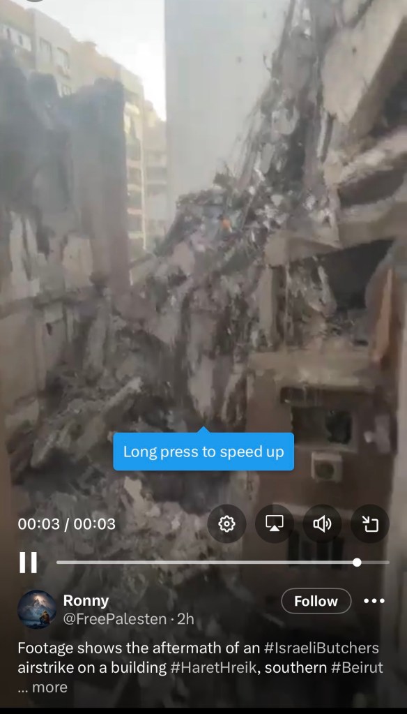 今から数時間前、まだ日の名残で明るい午後7時40分ごろ、車で10分も離れていないベイルート市南部のHaret Hreik地区が空爆された。イスラエル軍は声明で、数日前にゴラン高原のMajidal Shams(ドゥールーズ派の村)で子供12人を殺害した攻撃を主導した司令官を標的にした、と述べた。